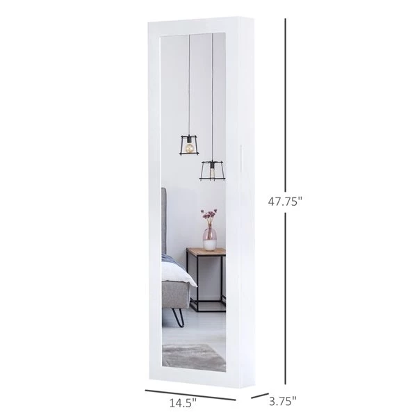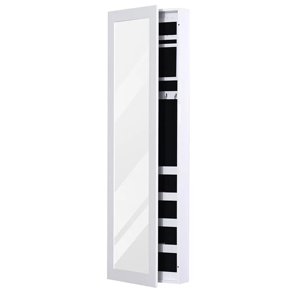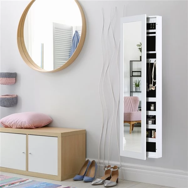 Cette armoire à bijoux blanche avec miroir est conçue pour ranger et organiser tous vos bijoux en un seul endroit. Avec ses deux trous à l’arrière, elle est facile à installer au mur.