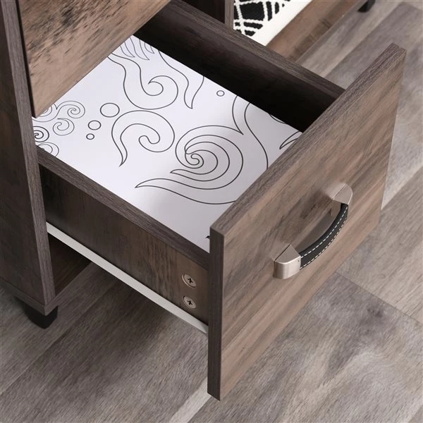 - Le meuble d’inspiration rétro, avec un grain de bois patiné et des poignées en cuir, offre une esthétique d’antan