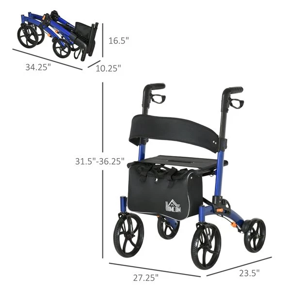 Déambulateur à roulettes pliant en aluminium noir et bleu par HomCom avec dossier de siège