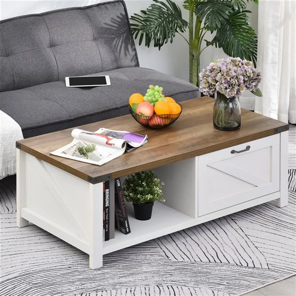 - Comprend une tablette à conception semi-ouverte, un tiroir de style porte de grange et une poignée rétro
